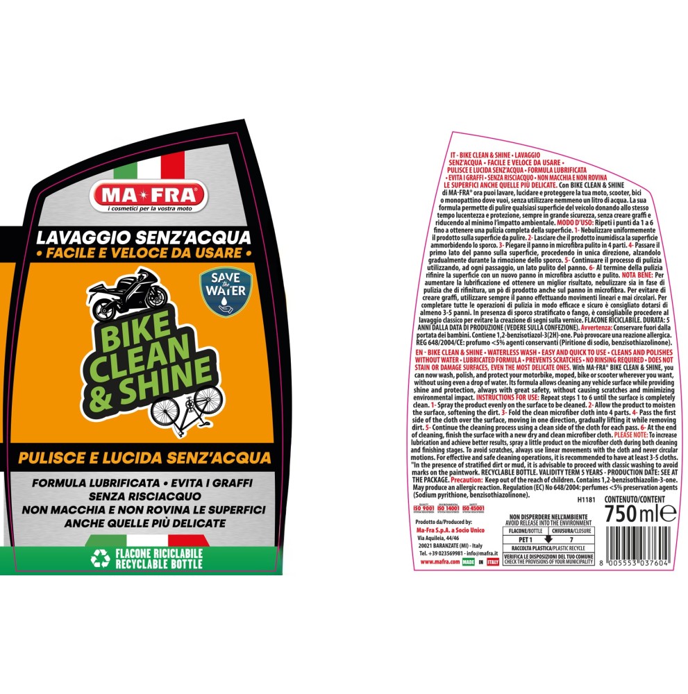 Se sei alla ricerca di un metodo semplice, rapido ed efficace per la pulizia senz’acqua di moto e scooter o per la cura della tua bicicletta, Bike Clean & Shine di Mafra è il prodotto che fa per te. Questo detergente innovativo, ideato per il lavaggio senz’acqua (dall’inglese waterless), è perfetto per chi vuole mantenere la propria moto o bici sempre impeccabile, anche senza disporre di un impianto di lavaggio. Ideale anche per la pulizia a secco dei monopattini.