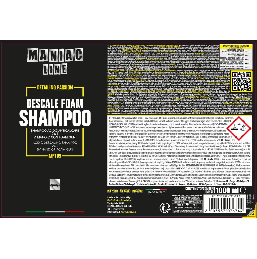 Descale Foam Shampoo Maniac Line è uno shampoo acido decalcificante anticalcare 2-in-1, studiato per eliminare le contaminazioni di calcare che opacizzano la carrozzeria.