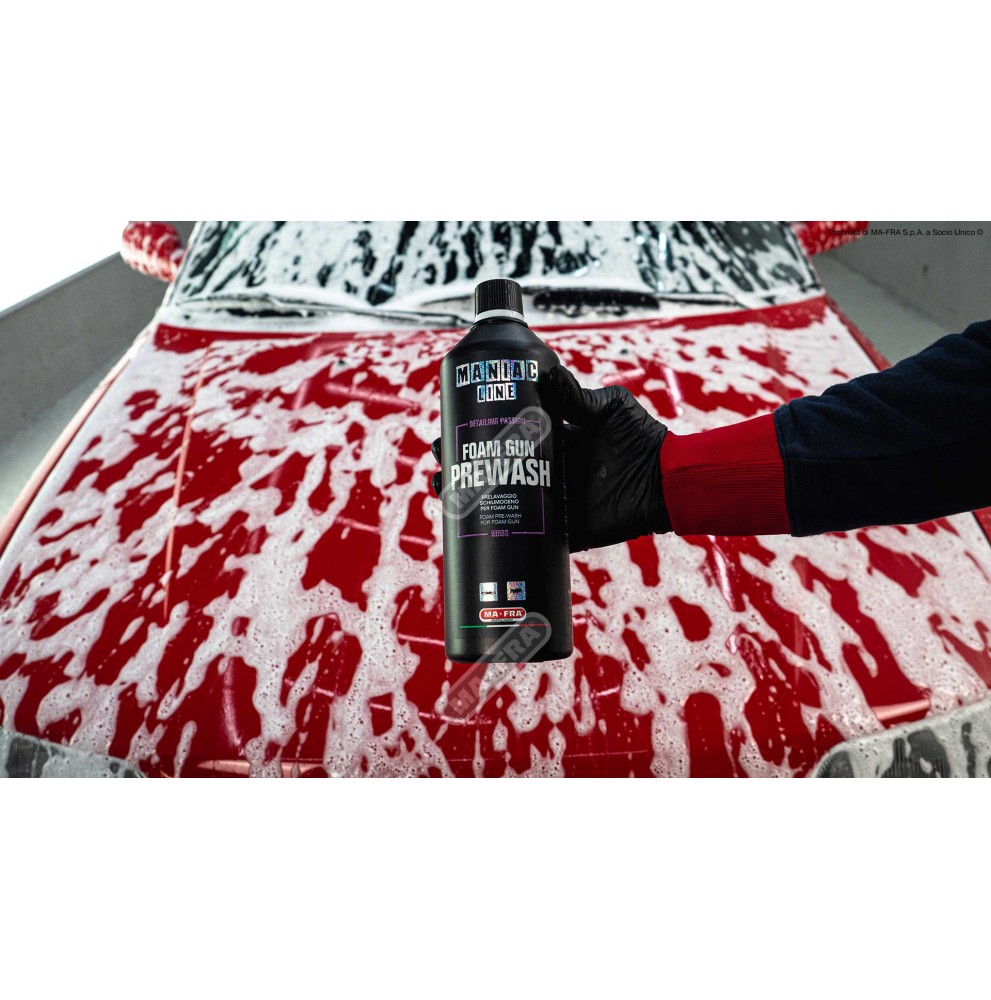 - Foam Gun Prewash: Prelavaggio schiumogeno potente e sicuro a schiuma secca e compatta per foam gun da utilizzare nella fase di prelavaggio.