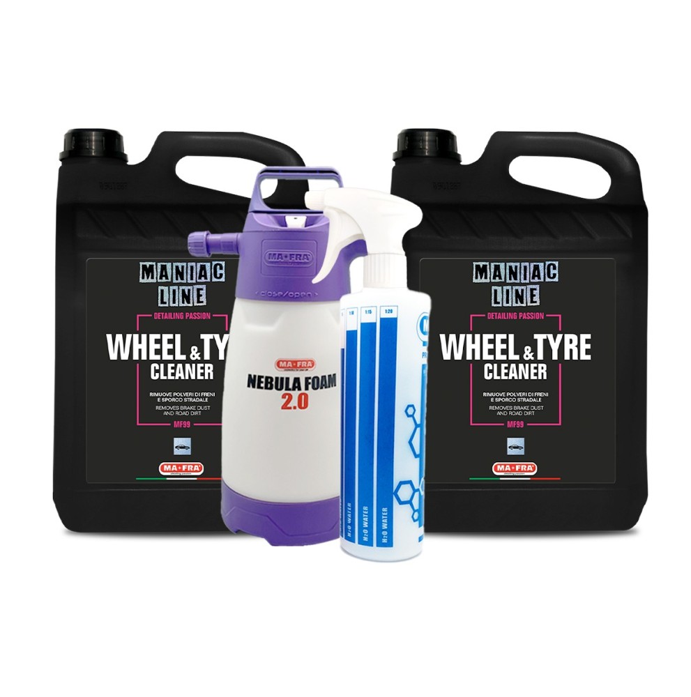 - Wheel & Tyre Cleaner formato tanica da 4500ml: nel kit sono presenti 2 taniche da 4500ml l’una. Ogni tanica equivale all’acquisto di 4 flacone e mezzo da 1000ml, con questo Kit avrai un maxi-risparmio! Wheel & Tyre Cleaner, detergente che utilizzato con Nebula Foam 2.0 è in grado di creare una potente schiuma lubrificata ad alto potere pulente in grado di rimuovere lo sporco più ostinato dai tuoi cerchi e pneumatici, garantendo una pulizia profonda e duratura;