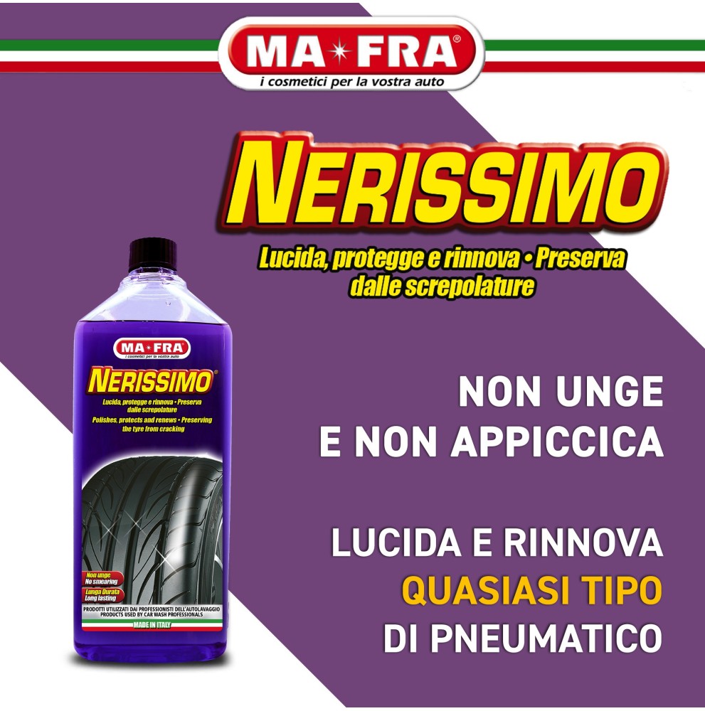 Grazie alla sua particolare formulazione non unge e non appiccica: caratteristica molto importante quando si utilizza il prodotto. Nerissimo crea un film protettivo che respinge acqua e sporco, previene screpolature, ingrigimenti e l’azione dannosa dei raggi UV, mantenendo lo pneumatico come nuovo più a lungo.
