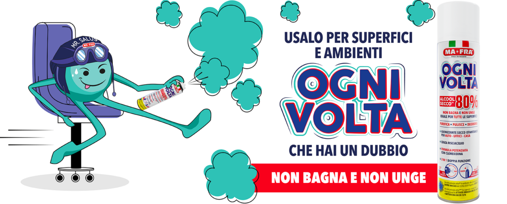Ogni Volta di Mafra è lo spray igienizzante ad ampio spettro con 80% di alcool di origine vegetale, potenziato da Clorexidina e Triammina. La sua formula secca e istantanea purifica ogni superficie senza lasciare residui e senza necessità di risciacquo.