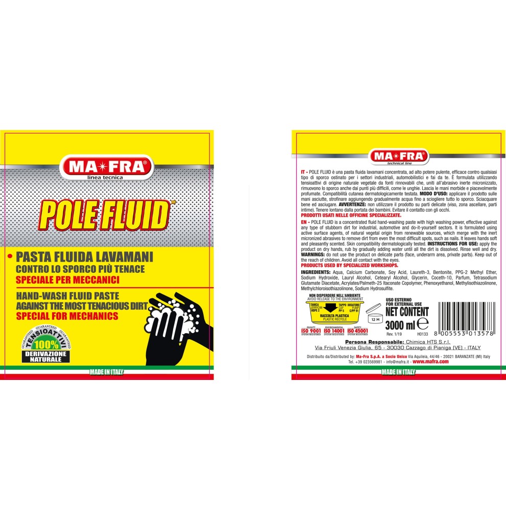 Pole Fluid è la pasta lavamani fluida concentrata studiata per professionisti che affrontano sporco ostinato in ambito industriale, automobilistico e fai da te. Grazie alla consistenza fluida, si spalma facilmente su mani asciutte e raggiunge punti difficili come sotto le unghie. La produttività migliora: meno tempo per il lavaggio e mani sempre perfette.