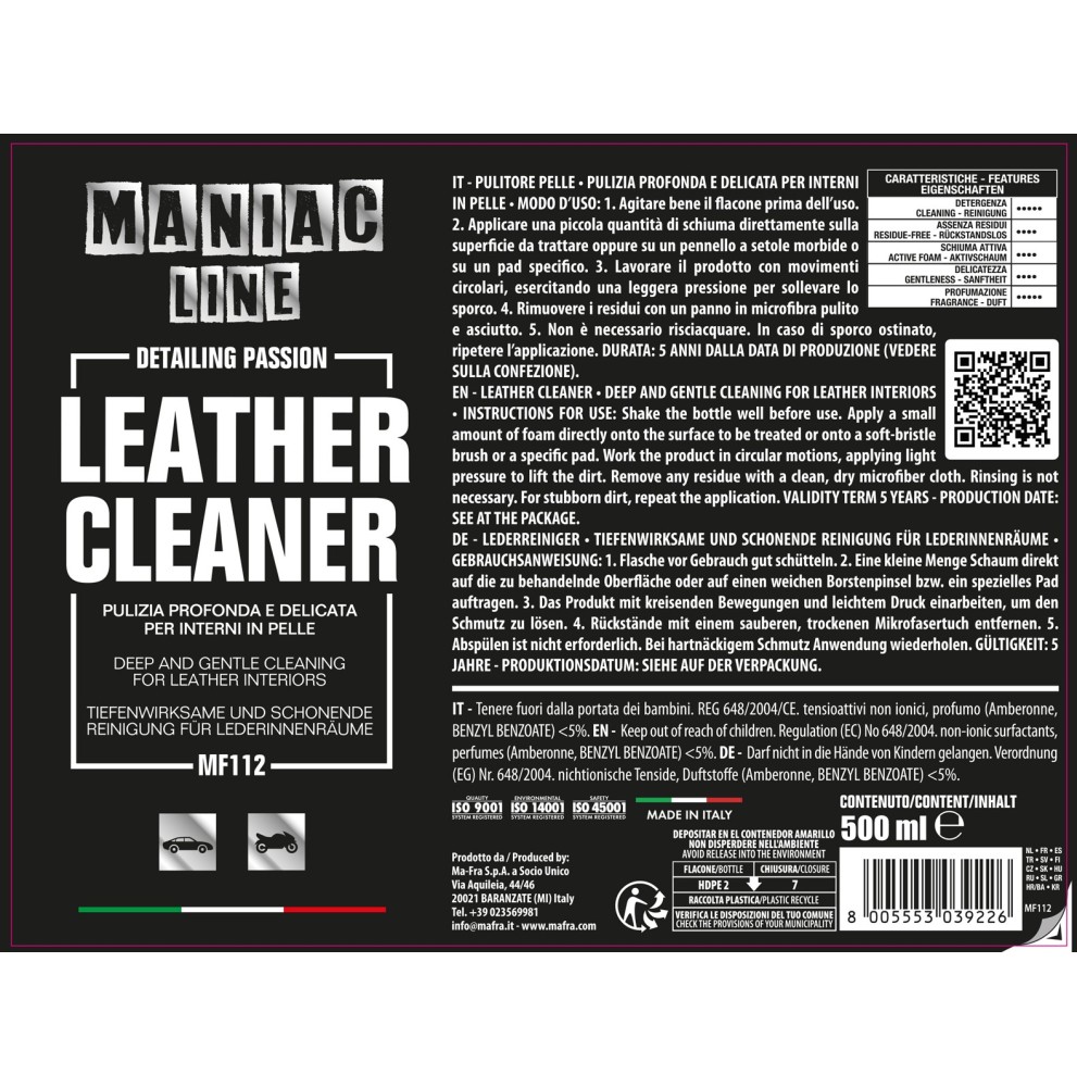 Leather Cleaner di Maniac Line utilizza una formula esclusiva, pensata per rimuovere delicatamente lo sporco più ostinato senza compromettere la qualità della pelle. Privo di sostanze aggressive e di solventi che potrebbero causare screpolature, secchezza o perdita di colore, questo detergente è sicuro anche per la pelle più delicata. Essendo un detergente in schiuma, trattiene meno acqua rispetto a uno spray liquido, rendendo l'applicazione uniforme e prevenendo la formazione di macchie causate, ad esempio, da un'erogazione non controllata, soprattutto su superfici sensibili.