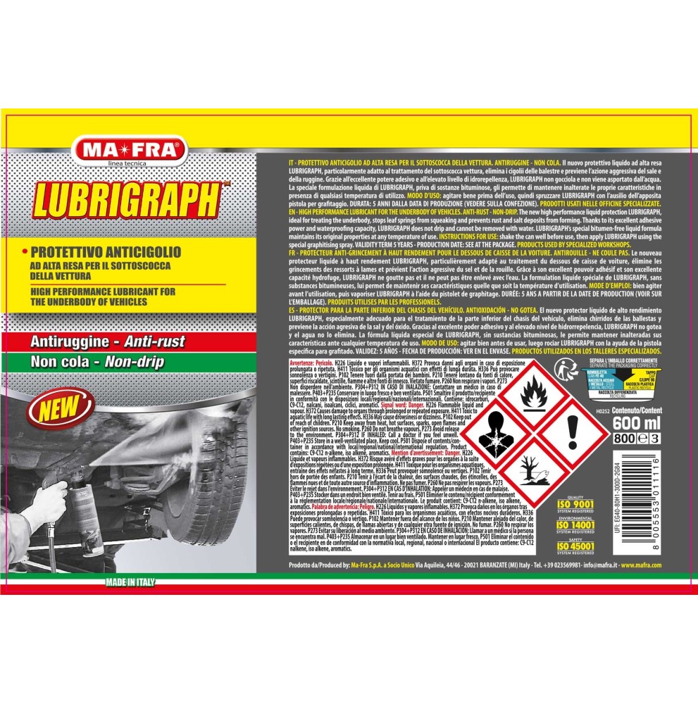 Lubrigraph è ampiamente utilizzato nelle officine specializzate grazie alla sua formula innovativa, pensata anche per chi lo applica: non contiene sostanze bituminose, non cola e non sporca l’ambiente di lavoro.
