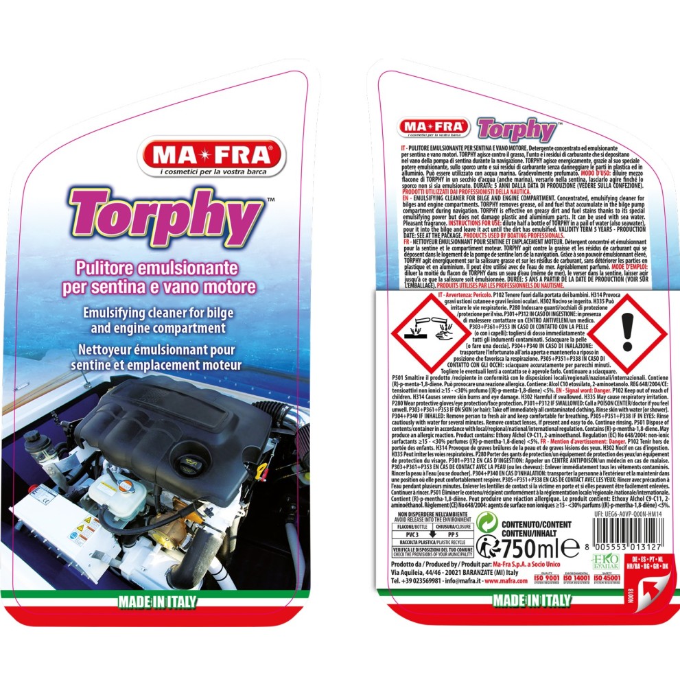 TORPHY è un detergente concentrato ed emulsionante studiato per la pulizia completa di sentina e vano motori.