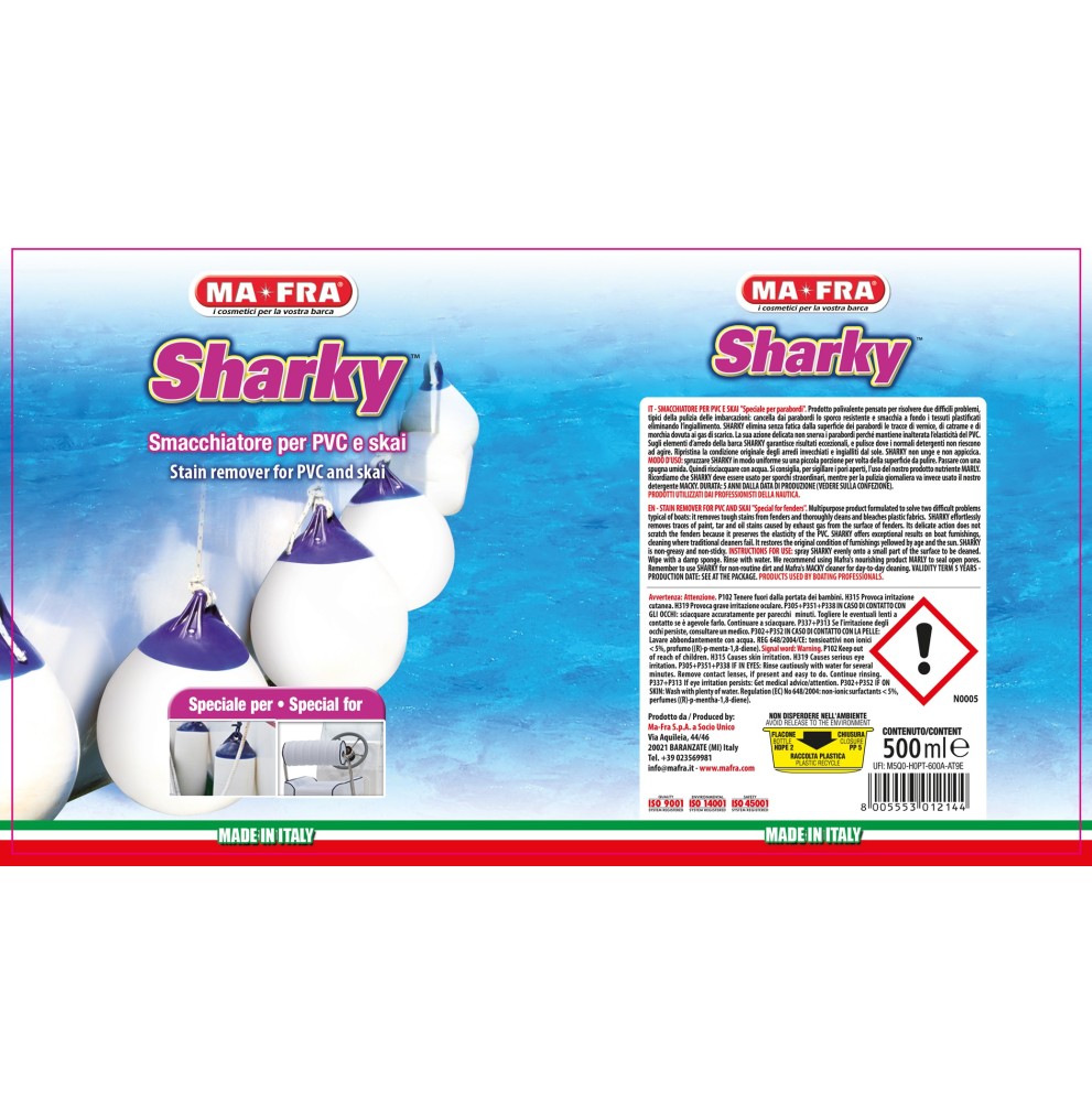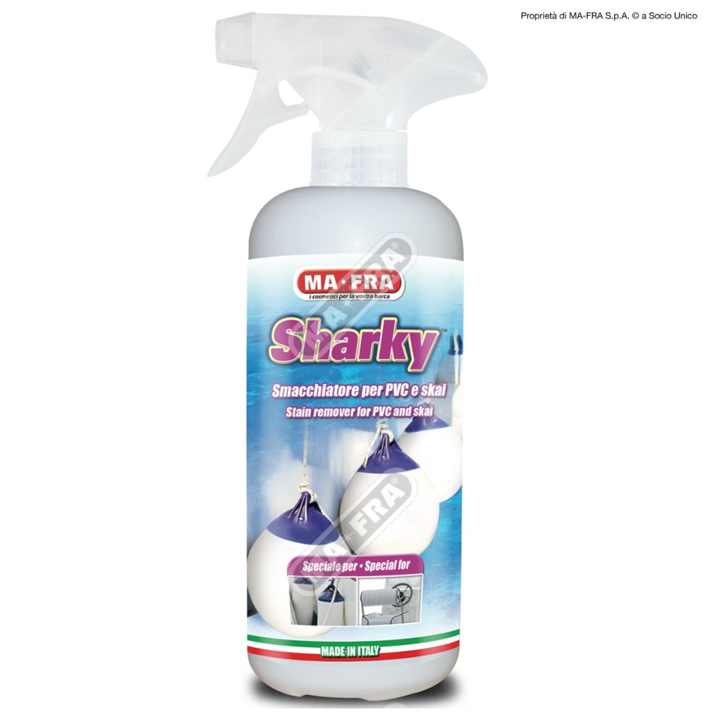 SHARKY è il prodotto pensato da MA-FRA per cancellare dai parabordi lo sporco resistente e smacchiare a fondo i tessuti plastificati eliminando l'ingiallimento.