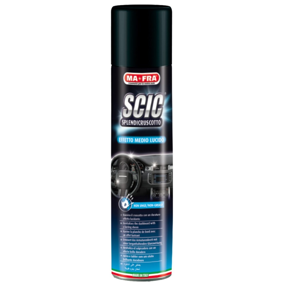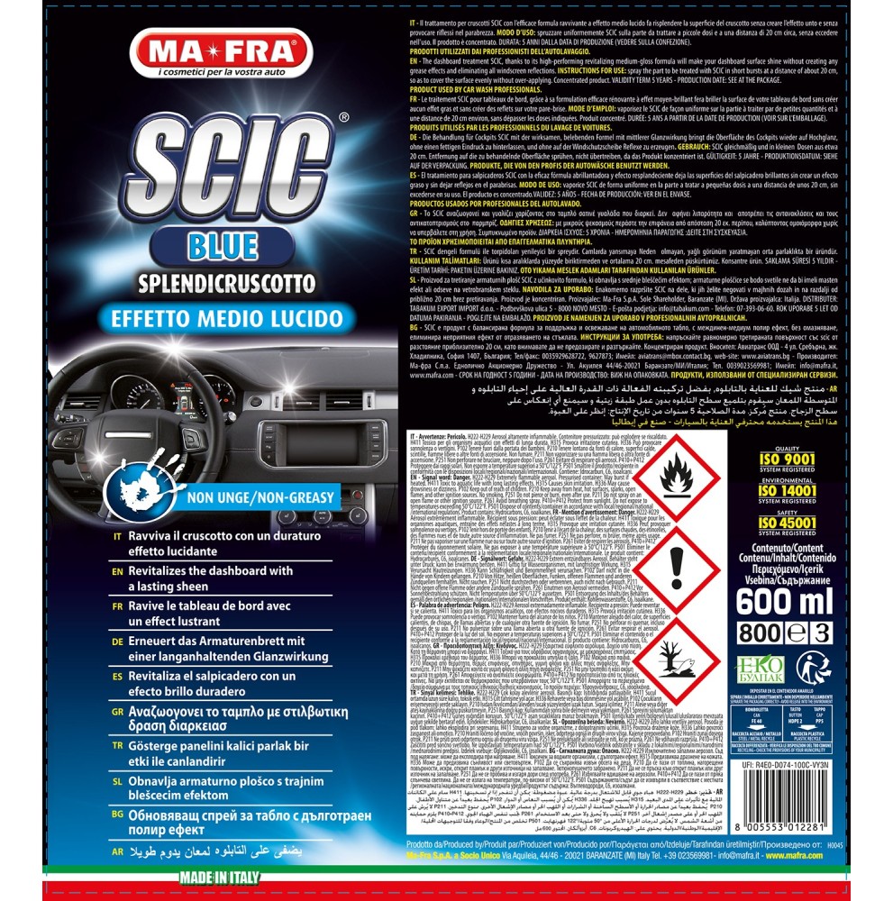 Scic Blu di Mafra è lo spray lucidante ideale per chi desidera restituire al proprio cruscotto auto un aspetto curato e professionale. La sua formula esclusiva offre un effetto medio lucido perfetto per eliminare l’opacità senza ungere o creare riflessi indesiderati sul parabrezza durante la guida.