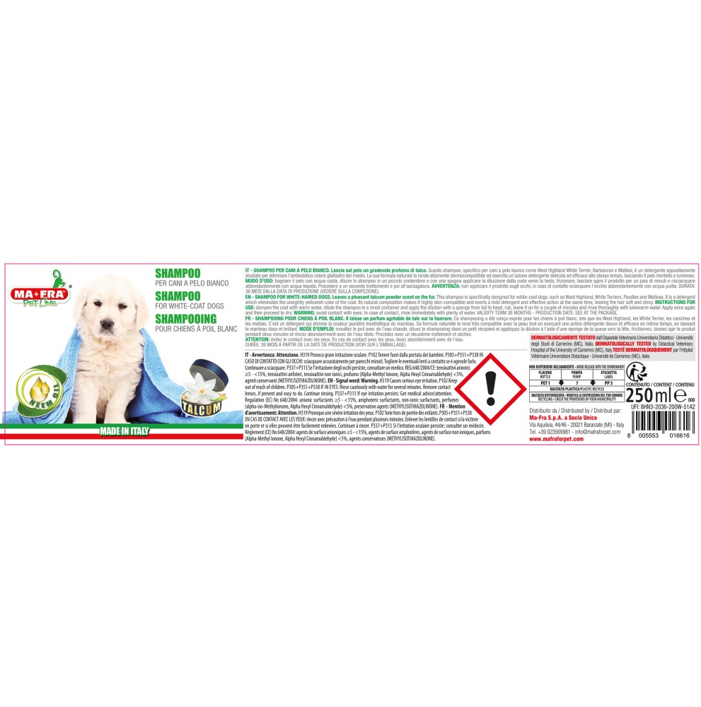 SHAMPOO PER CANI A PELO BIANCO è parte della Linea PET LINE BODY di MA-FRA: un’innovativa linea di prodotti nata e realizzata per lavare cani, gatti e furetti assicurandosi risultati efficaci, duraturi e profondi.