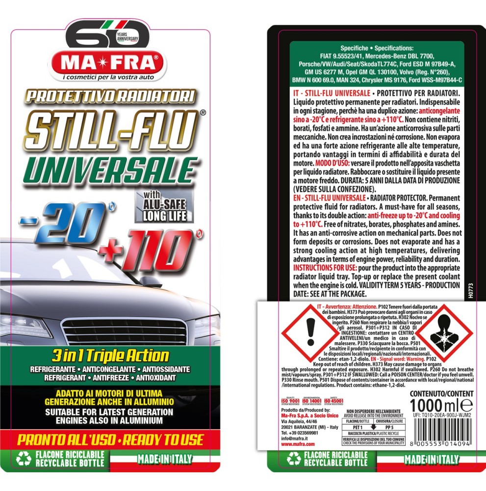 Still Flu è il liquido protettivo per radiatori che combina tre funzioni essenziali in un unico prodotto: refrigerante, anticongelante e antiossidante. Progettato per motori moderni, anche in alluminio, garantisce massima compatibilità e protezione continua.
