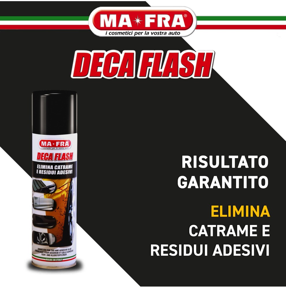 Deca Flash è utilizzabile sia sulle parti metalliche che sui vetri. Grazie alla sua particolare formula ricca di principi attivi rispettosi dell’ambiente, non altera le parti trattate.