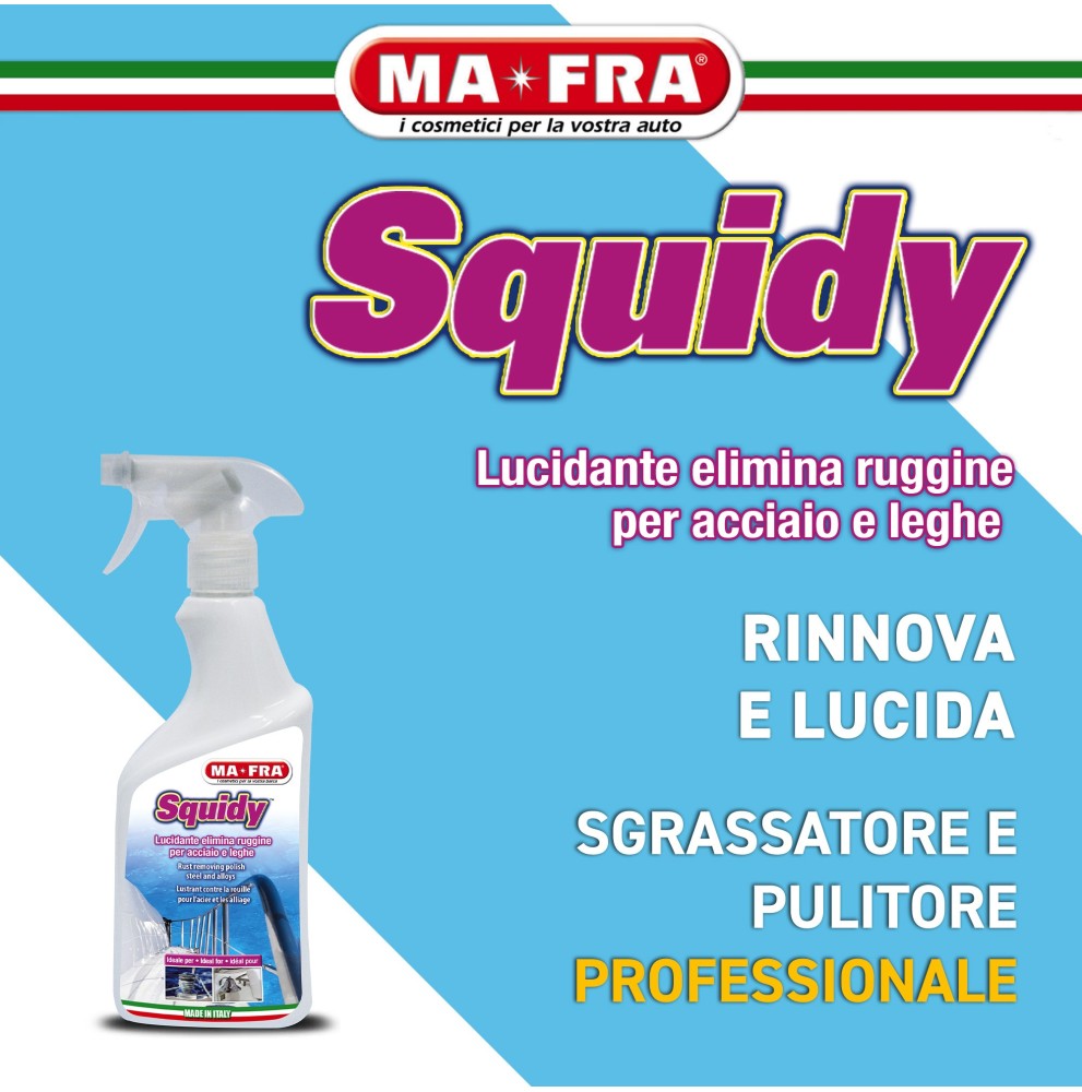 SQUIDY è un detergente formulato per eliminare macchie e tracce di ossidazione da superfici metalliche e parti cromate. Non utilizzare su piani di cottura, frigoriferi e attrezzature da cucina