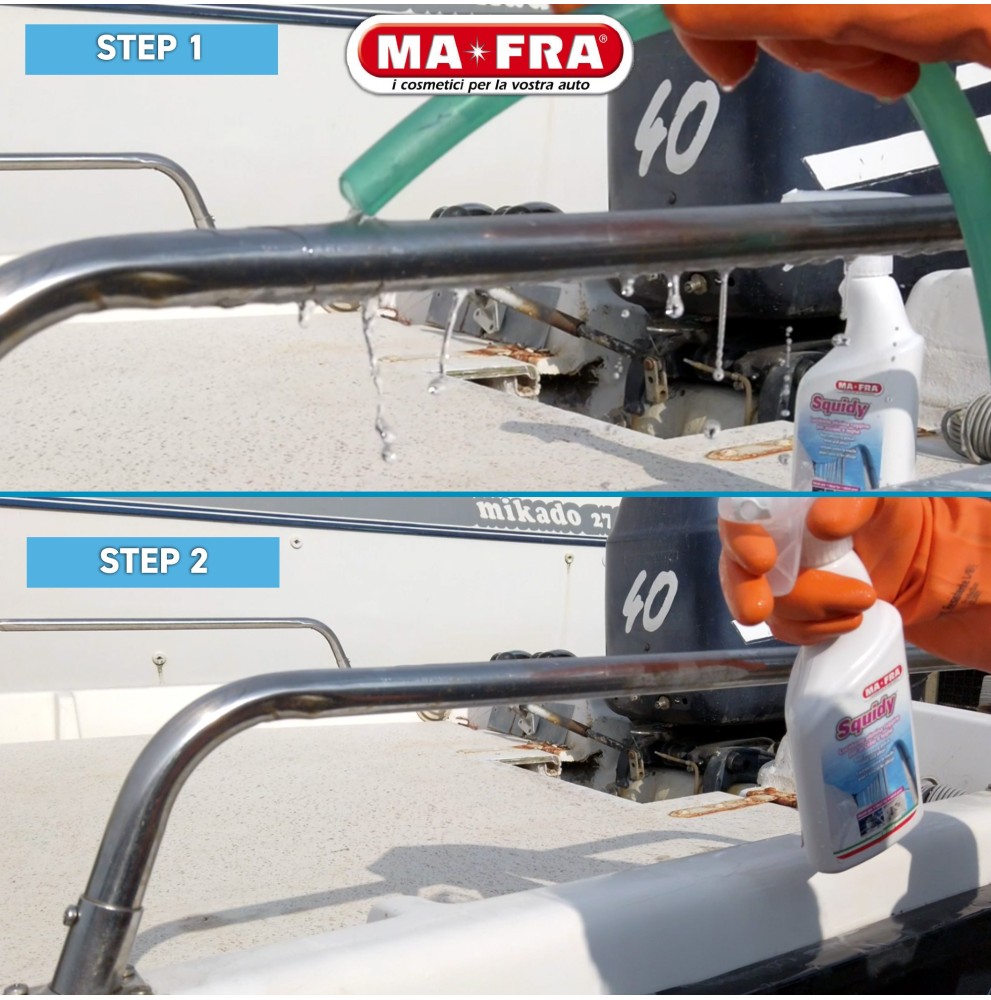 SQUIDY, grazie alla sua azione ad ampio spettro, rinnova e lucida le parti in acciaio e in lega esterne delle imbarcazioni come: tientibene, candelieri, scalette, roll-bar, liberando dall’ossido e ravvivando sia le parti opache che le parti cromate.